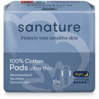 De maandverband van Sanature Ultra Night is voor de zware menstruatie en voor de de zware menstruatie tijdens de nacht. Het is gemaakt van 100% katoen en daarom is het gelijk tegen roodheid en jeuk. Het voorkomt irritatie, en is het hypoallergeen maandverband. De Sanature Maandverband Ultra Night is geurvrij maandverband, maar ook parfumvrij maandverband.