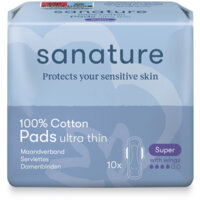 Maandverband van Sanature is gemaakt van 100% katoen. Katoen zorgt goed voor een gevoelige huid. Sanature maandverband voorkomt en is ter behandeling van roodheid en jeuk van de vagina. Het is dermatoligisch getest en is een gecertificeerd medisch hulpmiddel.